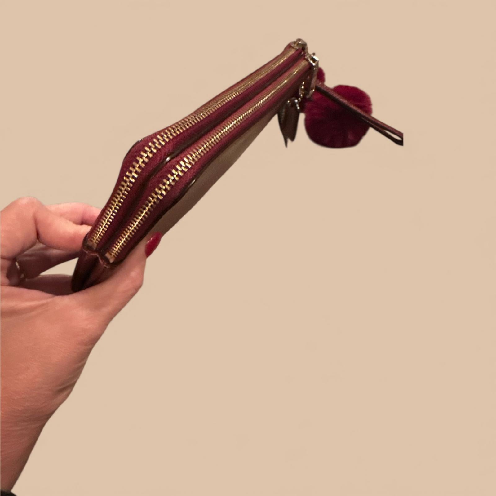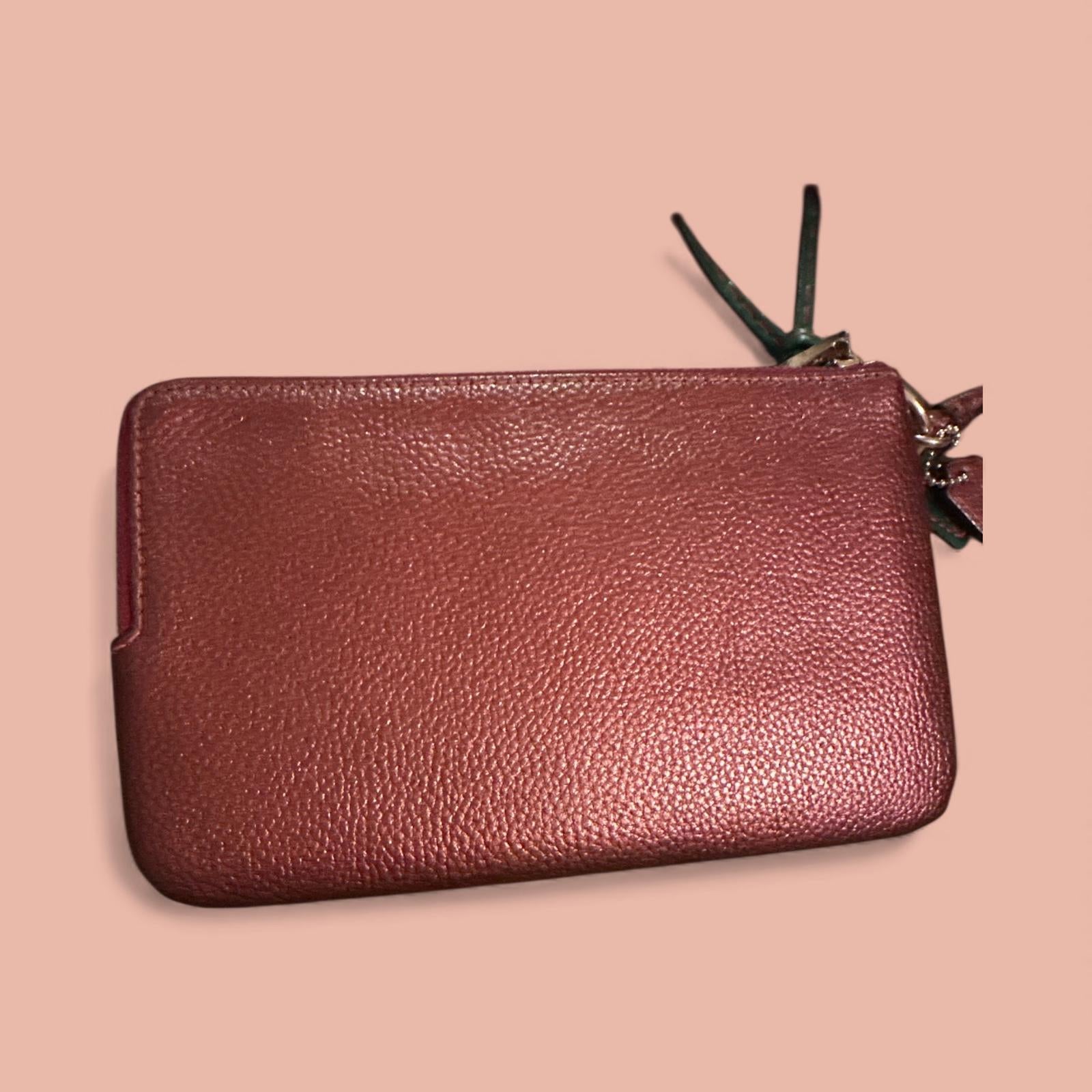 Elegant Coach wristlet clutch crafted from rich pebbled leather in a deep burgundy shade with metallic hue. Adorable small coach hang tag.