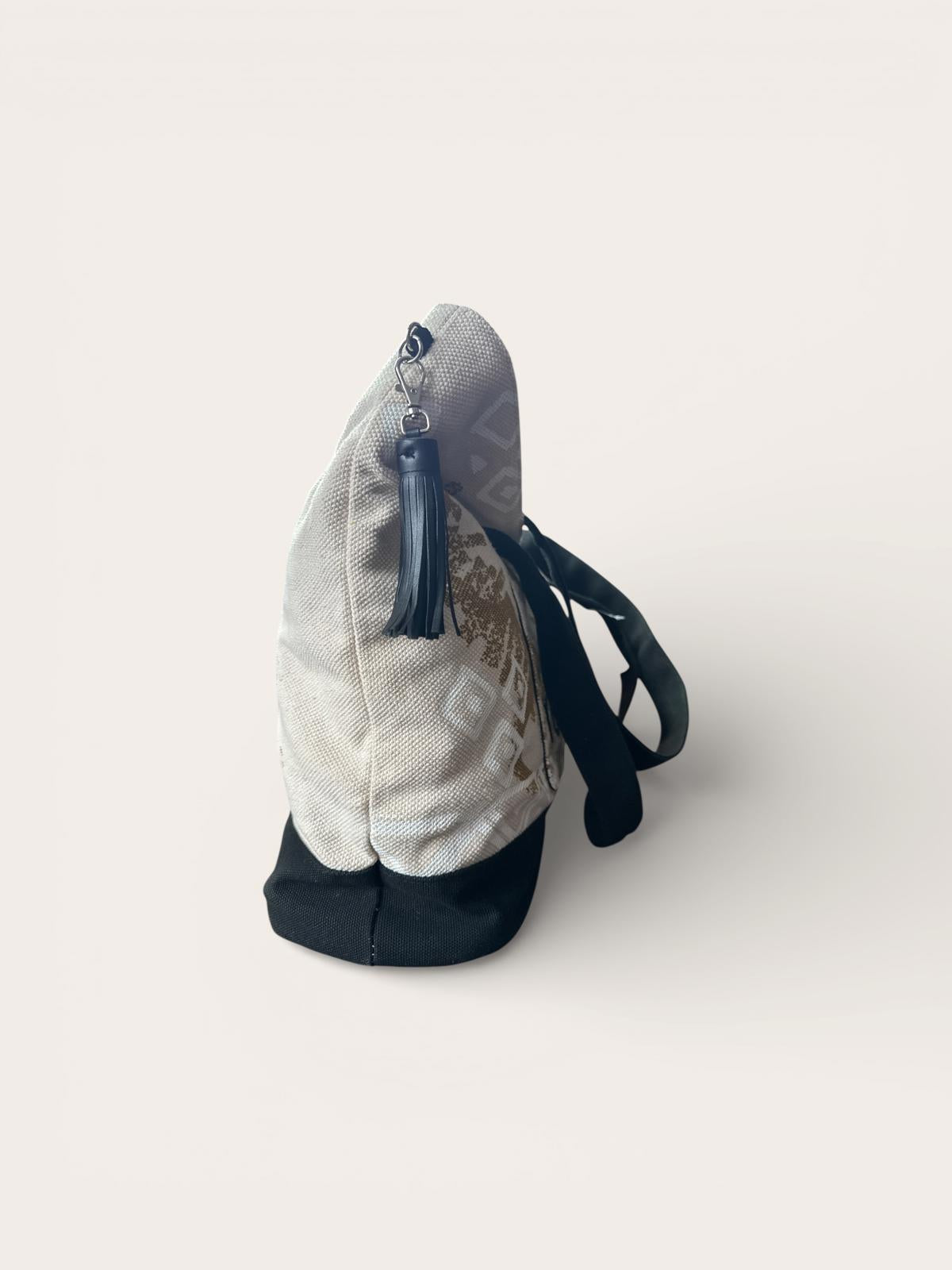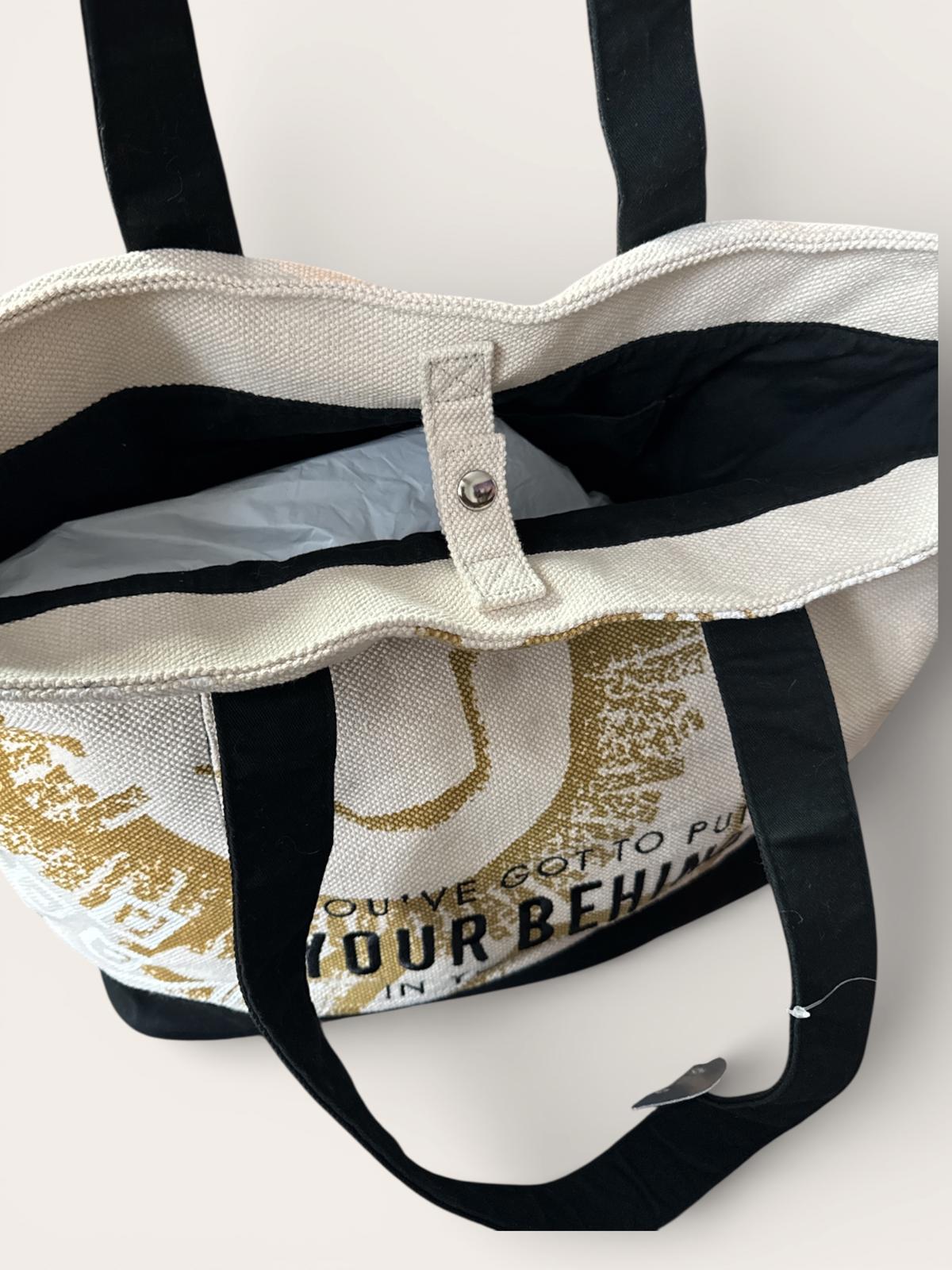 Sturdy canvas tote bag featuring a motivational quote, perfect for everyday use. Designed with durable black handles and a spacious interior secured by a snap button closure. Includes an exterior front pocket and a side tassel detail for added style. The neutral color palette and practical design make it a versatile accessory for casual outings or errands.