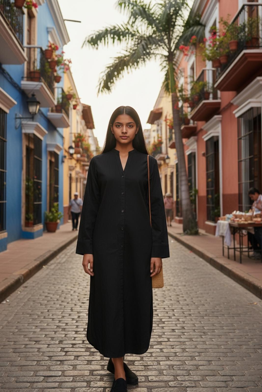 This elegant black maxi dress features a sleek button-down front and a modest V-neckline for a timeless look.