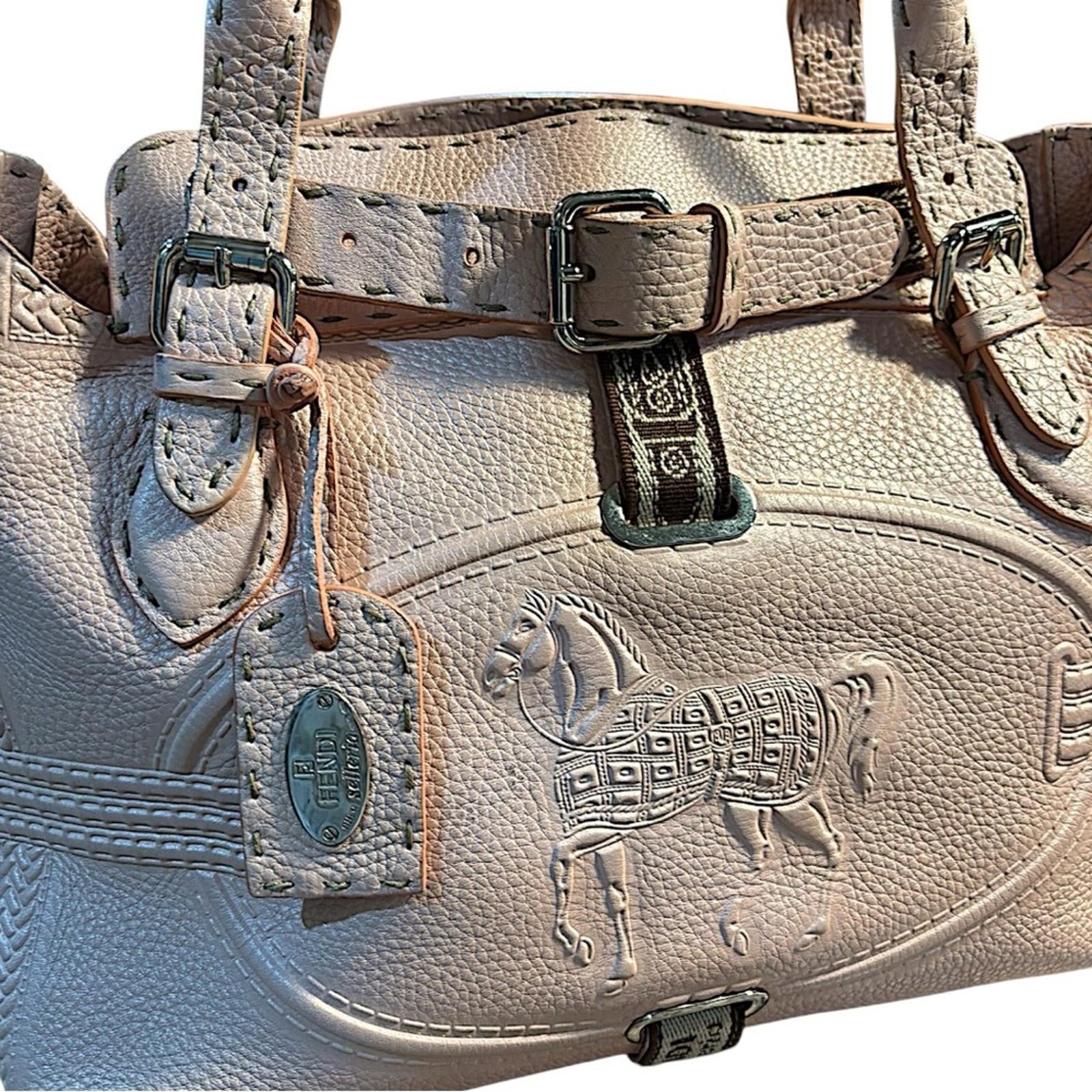 Features:Top handles, adjustable belt straps, embossed horse detail, logo fabric tabs, stitched edges, Fendi metal hangtag