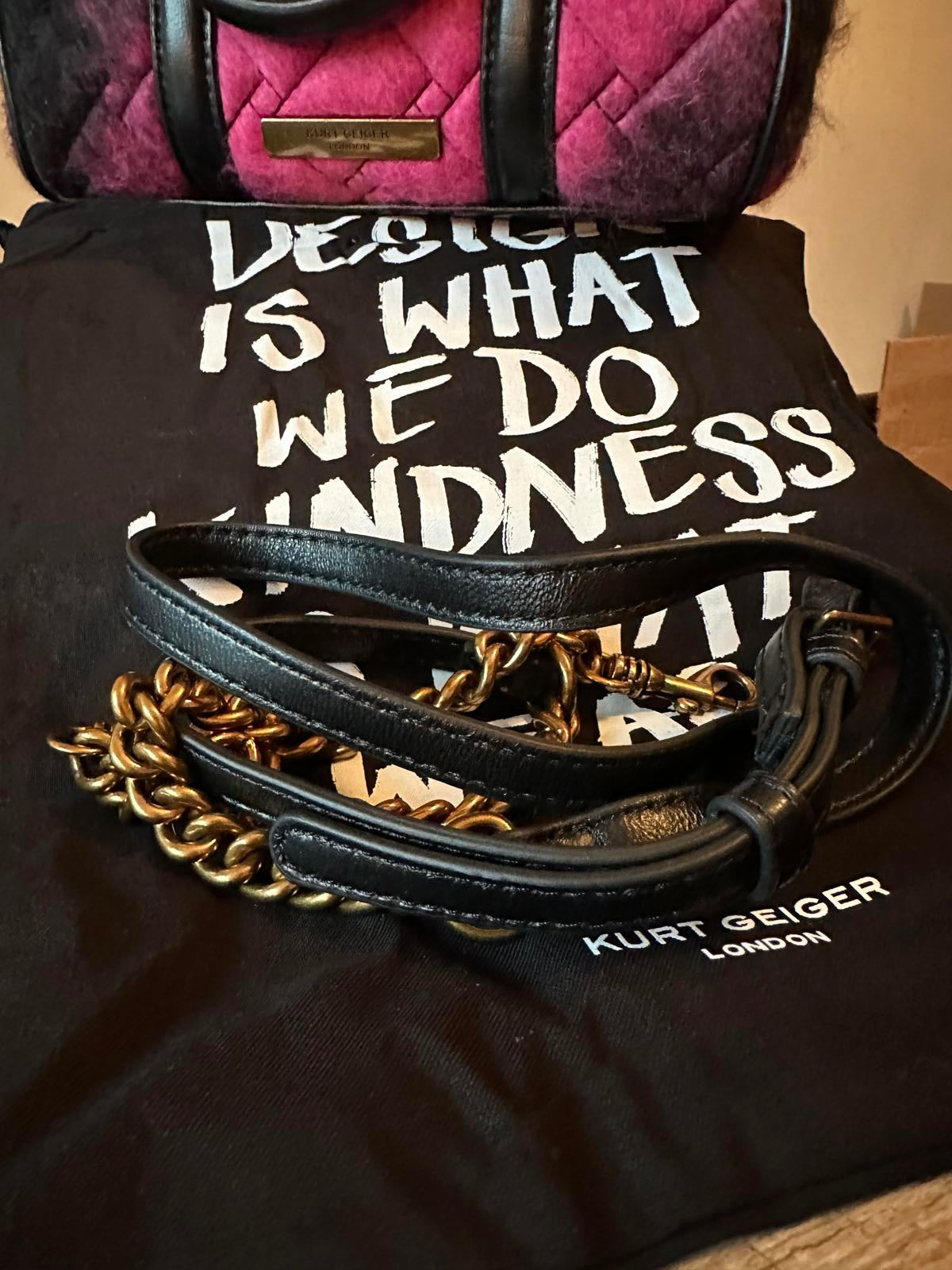 Elevate your style with this **NWT Kurt Geiger handbag**, featuring a striking pink-to-black gradient faux-fur finish and signature quilted design. Sized at **9x6 inches**, it’s compact yet roomy enough for daily essentials. The sleek black top handles add durability and contrast, making this the perfect statement piece for day or night. Ideal as a **women’s fashion purse, small tote, or collectible Kurt Geiger accessory**. A standout gift for any style lover.
