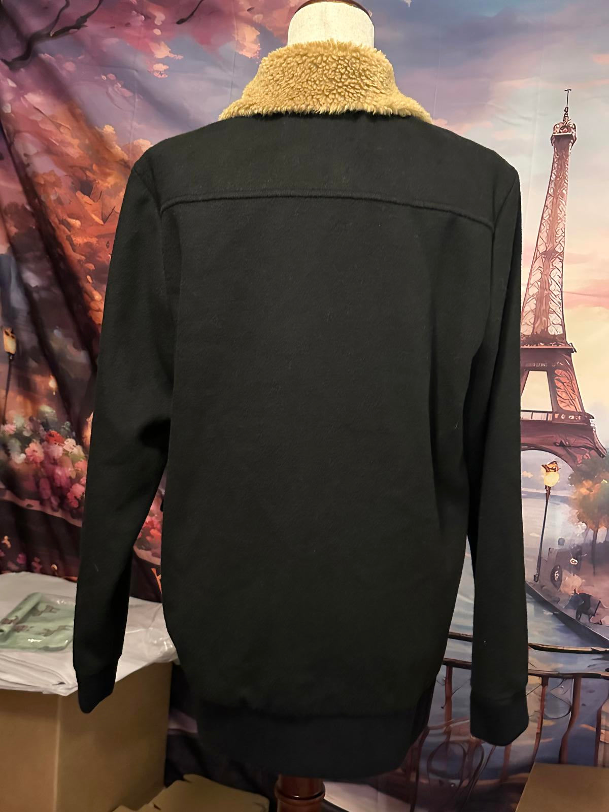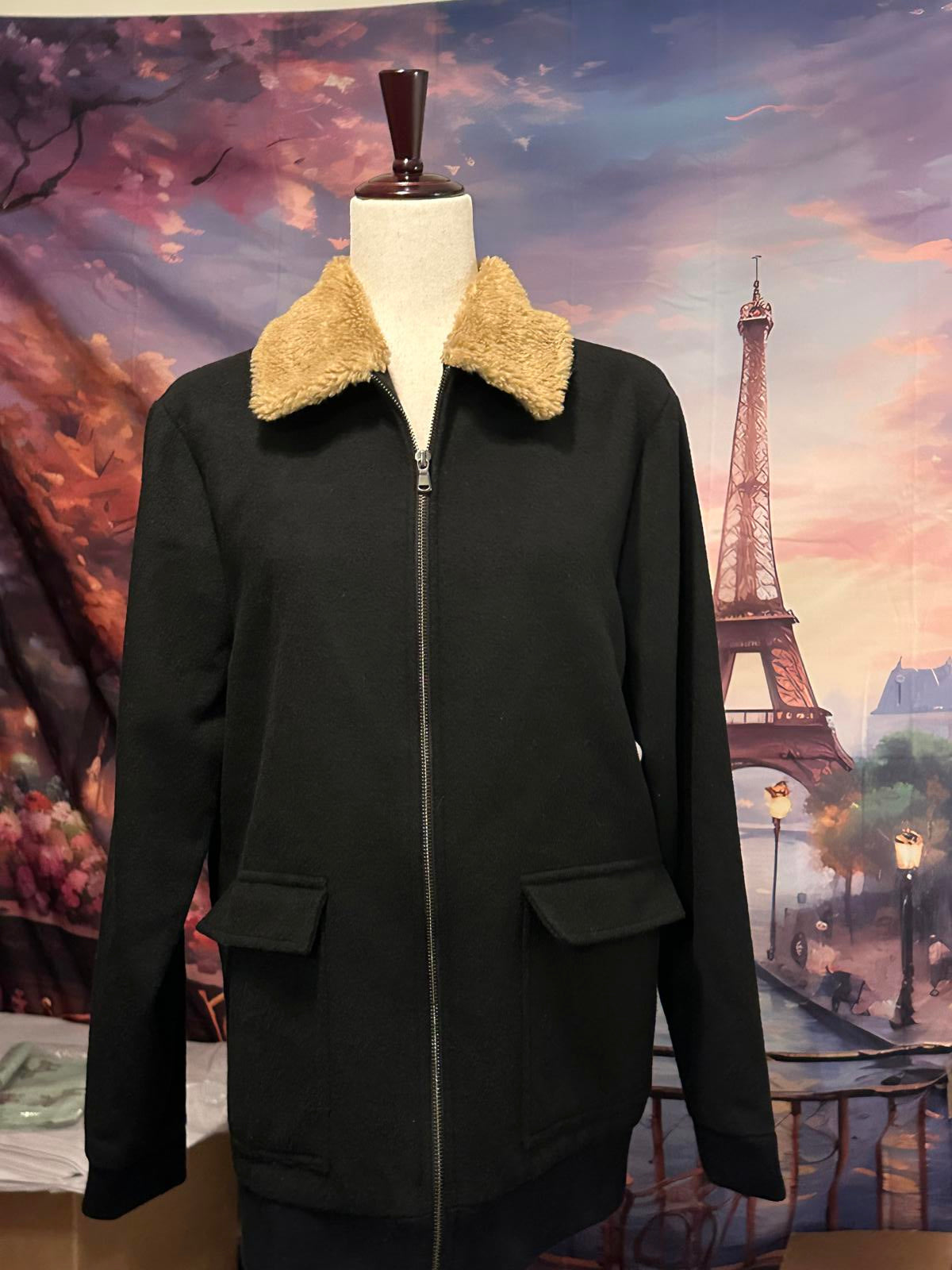 Stylish black women's jacket featuring a warm, tan faux fur collar for added comfort and elegance.