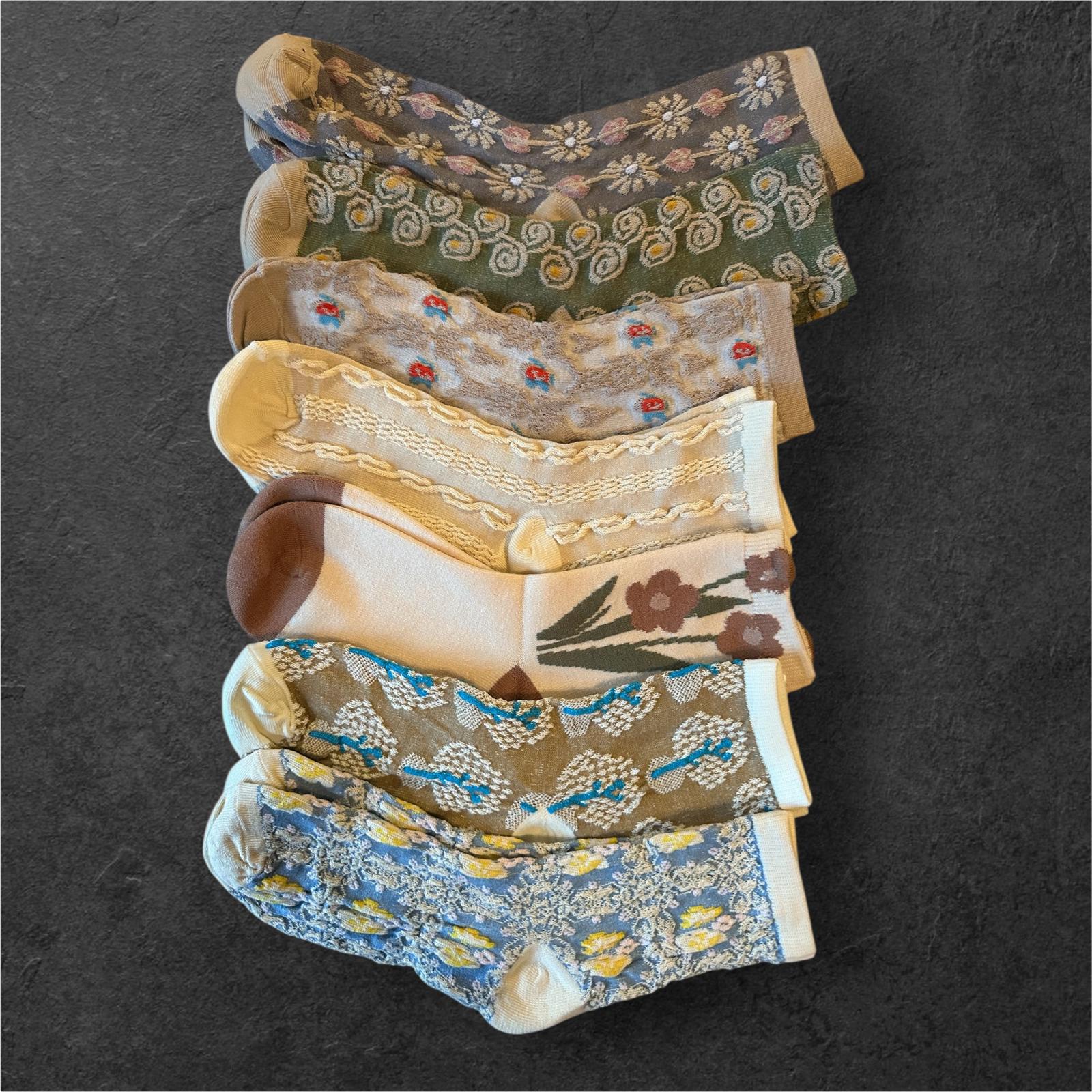 A beautiful set of seven pairs of socks featuring intricate embroidered floral designs.